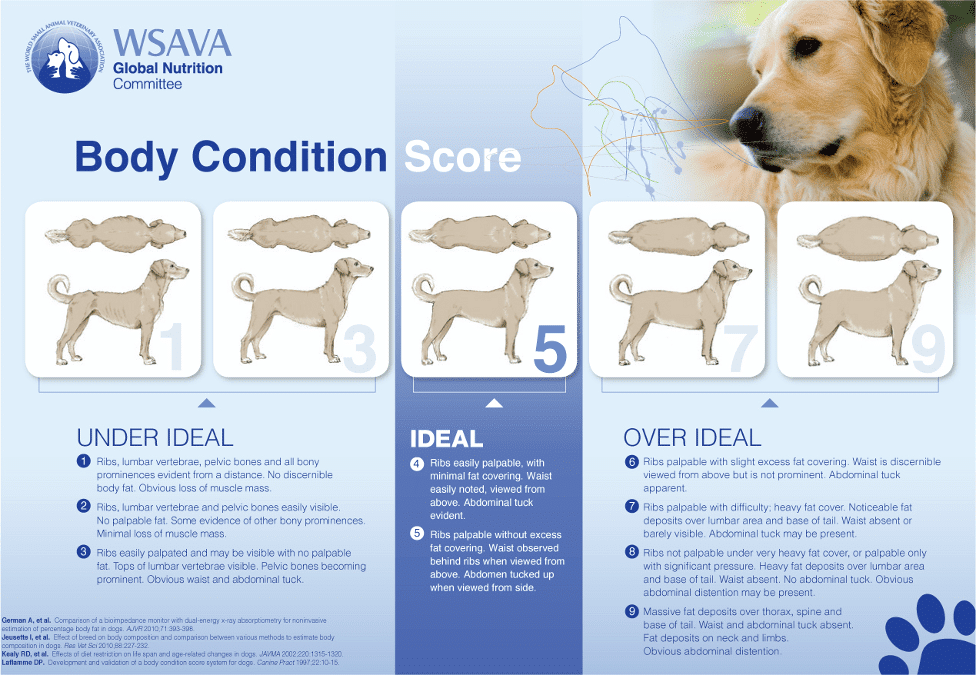 The Body Condition Score System focuses on the amount of skin and tissue that can be felt over the ribs, as well as the shape over the waist and underbelly. A dog or cat with an ideal body condition will have a visible waist behind the ribs when viewed from above; the ribs can be felt through only a small amount of fat; and, when viewed from the side, the underbelly is tucked up.