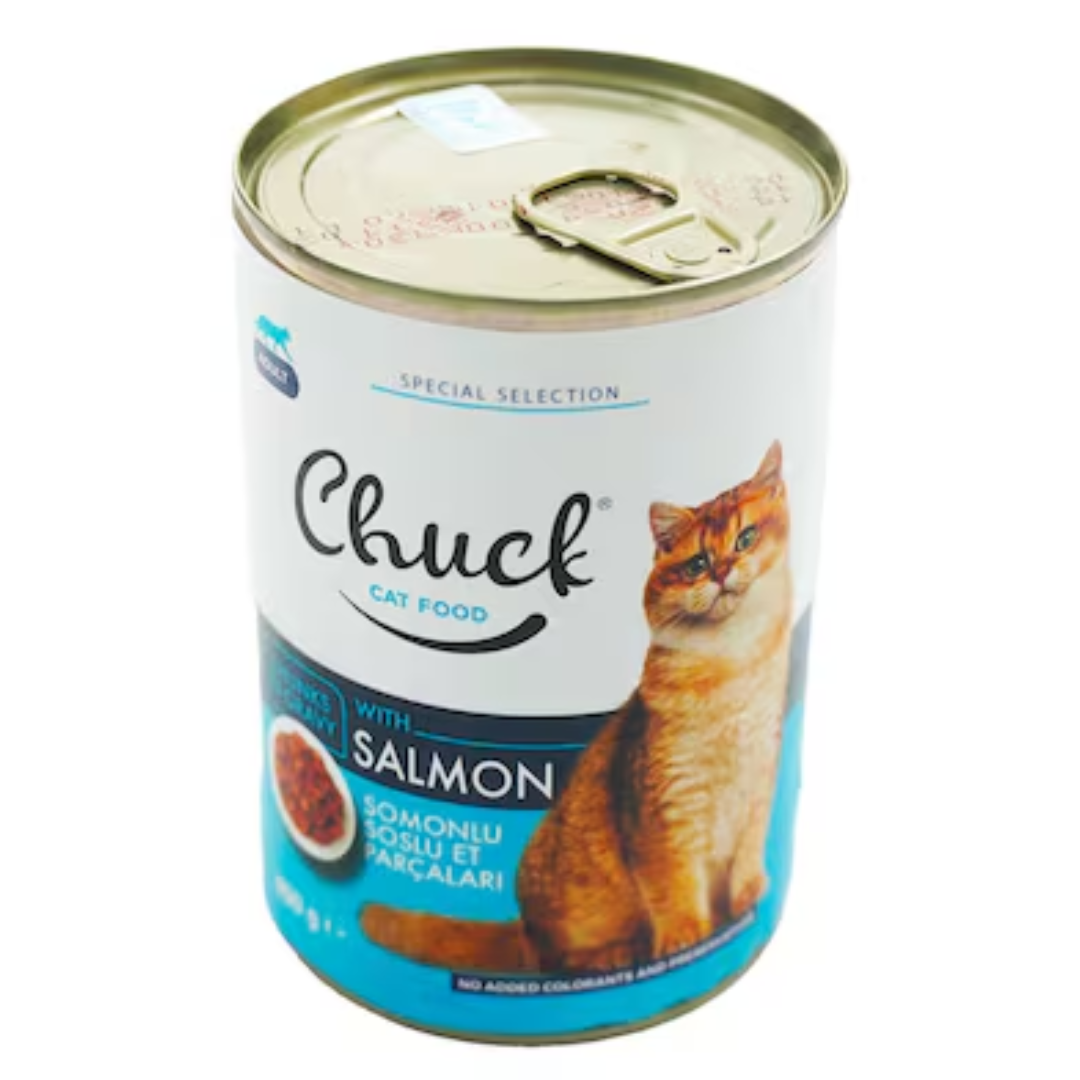 Chuck Adult Cat Salmon 400g is a nutritious wet cat food featuring real salmon, supporting heart health, a shiny coat, and overall well-being for adult cats.