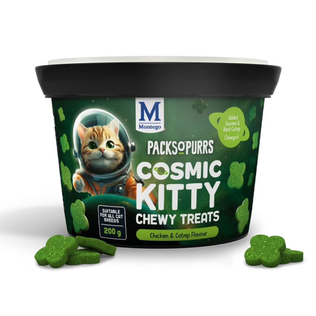 Make treat time a delight with Montego Packs O’ Purrs Cosmic Kitty Chewy Treats – Chicken & Catnip. Packed with real meaty flavor, natural catnip, and essential nutrients, every bite fuels your cat’s happiness and health. Give your furry friend a treat that’s truly cosmic—because they deserve nothing less than stellar!